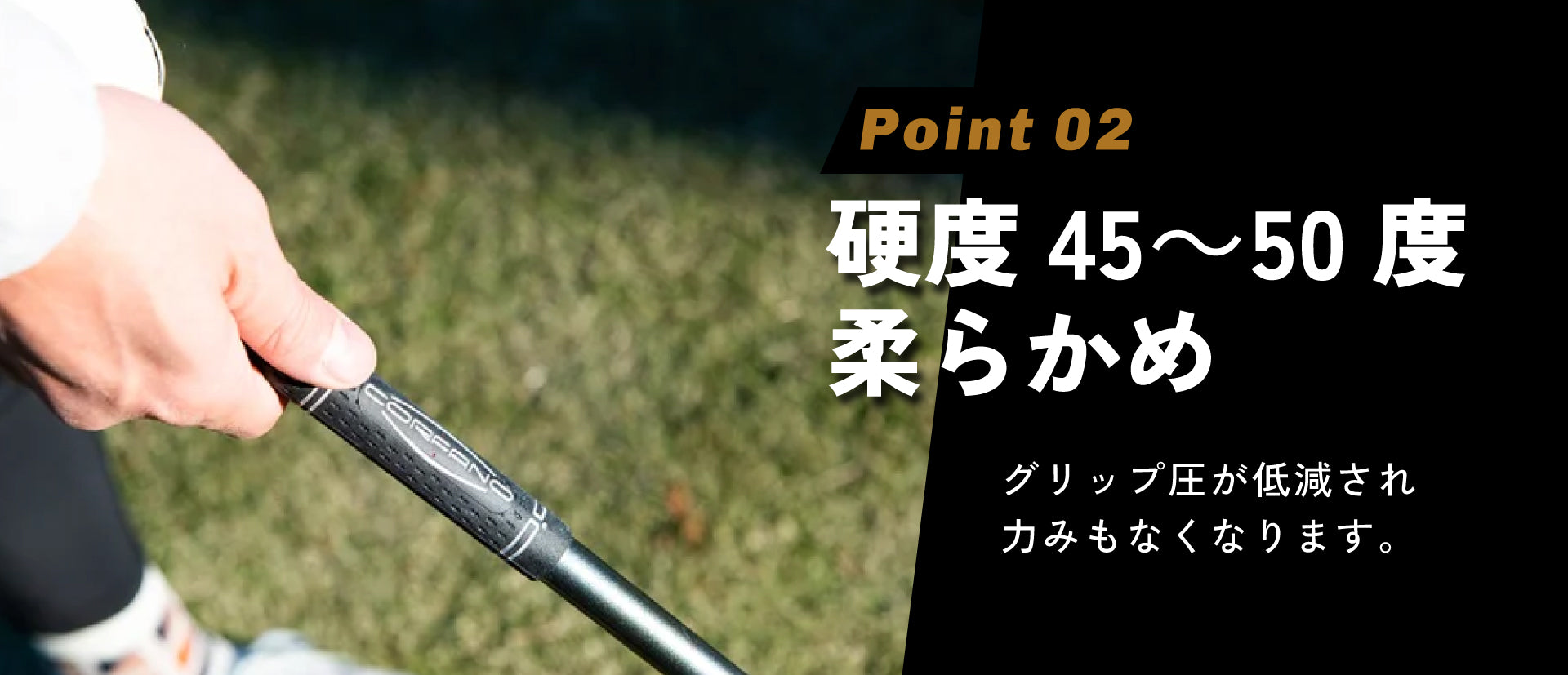 CORFANO最大の特徴は特殊素材を使用することで生まれる衝撃吸収性です。手や肘に与える衝撃を約1/3にまで抑えることに成功。ダメージを気にせず楽しくラウンドしていただきたい。そんな思いがカタチになりました。また衝撃を吸収することは疲労の低減にもつながります。